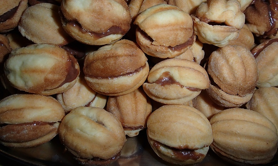 Nadzieniem wypełniać połówki orzeszków i sklejać po dwa razem.